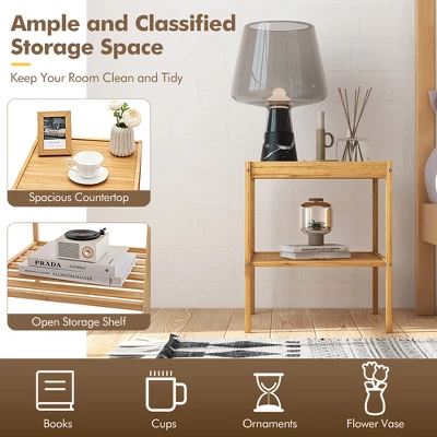 Our bamboo nightstands set of 2 are a great option for room decoration with its classic silhouette and contemporary chic style! With 1 spacious tabletop and 1 lower open shelf, the 2-tier nightstand provides display and storage space in your bedroom. The wide countertop allows you to organize and store all of your bedside essentials and the steady open shelf is suitable to store potted greenery or some books you’ve already read. Made of solid bamboo with sturdy and durable structure, the end table is designed for a long lifespan. Smooth and waterproof surface is easy to clean and maintain. Perfect as the side table, small accent table, and end table for small spaces, living room, and bedroom to bring a modern and fashionable decoration!