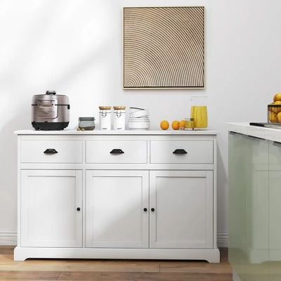 Buffet cabinet using thick MDF and particleboard, the overall structure is firm and not easy to shake. In addition, use of P2 grade plate, environmentally friendly and harmless. The unique buffet has three spacious drawers to facilitate your items, such as napkins, keys and other small items. Two cabinets with adjustable shelves are perfect for storing items of different heights. The simple and elegant style adorns the house while providing ample storage space. This beckoning storage cabinet is never let you down!