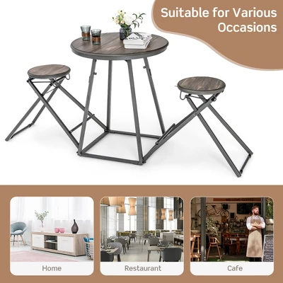 Modern table and stools set brings a charming and unique style to your space.Our stools are connected to the round table, and can be easily folded and stored under the table. This unique design not only makes it more decorative, but also saves your space. Made from high-quality MDF panels and sturdy steel, this dining table and chair set is super sturdy and durable, and the square table base and X-shaped structure of stools also provide stability. Besides, the anti-slip foot pads of stools and adjustable feet of the table protect the floor from scratches. This 3-piece round table set has wide applications and is perfect for the apartment, cafe, restaurant, etc.