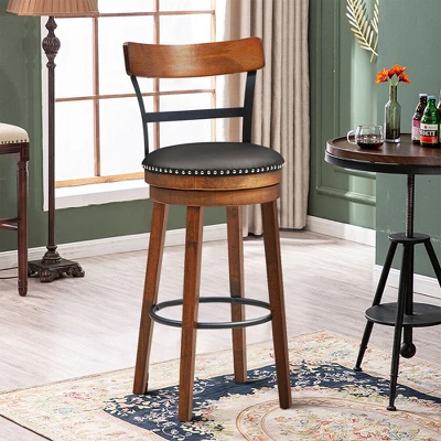 Our rustic swivel bar stool will provide you with a comfortable place to sit while adding a touch of elegance to your room layout. Made of selected rubber wood, this bar stool is durable and sturdy. The four thick flared legs with a built-in foot ring provide strong support and ensure their stability. Featuring 360-degree swivel design, this bar stool gives you the freedom of flexible movement, so you can communicate with others in any direction. Besides, PVC cushioned seat is comfortable to sit. You can put your legs on the footrest and enjoy leisure time. With its rustic appearance, our bar height stool is perfect for bistro, kitchen, coffee house, etc. Don’t hesitate to buy it!