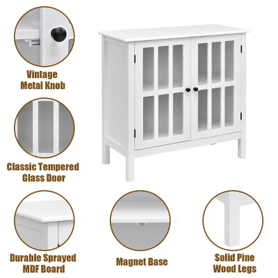 - Functional storage cabinet has 2 tempered glass doors that open to two shelves for versatile storage