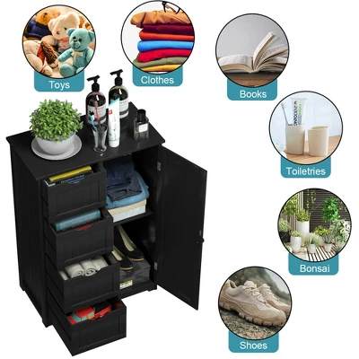 Create a cleaner, tidier and more attractive bathroom space with this four drawer cabinet. It features four deep drawers and a cupboard to conceal towels, toiletries and other essentials. The cabinet is made from hardwearing MDF with a clean brown finish to complement classic and modern interiors. Each drawer has a stylish slatted front and routed handle with wooden drawer slides to smoothly open and close. With a handle, the cabinet door houses an adjustable shelf to customize your storage space. You can also decorate the top of the unit with candles and other objects to add color and character to your bathroom.