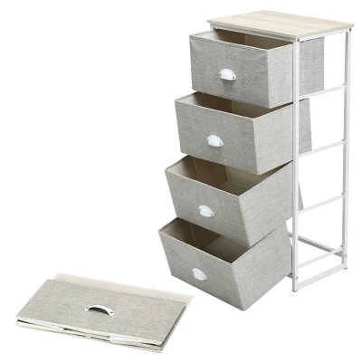 Are you still upset about the messy things? This drawer storage unit is your ideal option. Our beautiful and powerful 4 tier chest of drawers has a rectangle shape and can make your room full of charm. Made of sturdy and durable steel frame and thick medium density fiberboard, this drawer storage unit is solid enough to serve a long time. This chest of drawer comes with 4 folding fabric bins, which provides plenty storage space for you. It can be used in a variety of situations, whether it’s a bedroom, living room, office, dorm or even a closet, you can place it for storage. Even, you can use it as a coffee table.