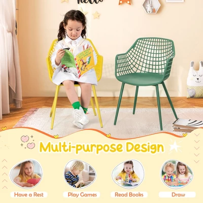 Need some chairs for your lovely child? Don’t miss this 4-pack toddler chair set. With colorful outlook and kids-sized height, these chairs will be popular among toddlers. Each chair features curved backrest with hollow-out design and ergonomic armrests to offer a comfortable sitting experience. Besides, the seat measures 13”x 12.5”(L x D), which is spacious enough for kids aged 3-7. Kids are allowed to freely sit or lean down on them. Meanwhile, made of premium PVC and metal legs, our chairs have a strong load-bearing capacity of 176 lbs and a long-lasting service life. Your little one will be delighted to have children’s furniture in their own size, which is a perfect gift for your kids.