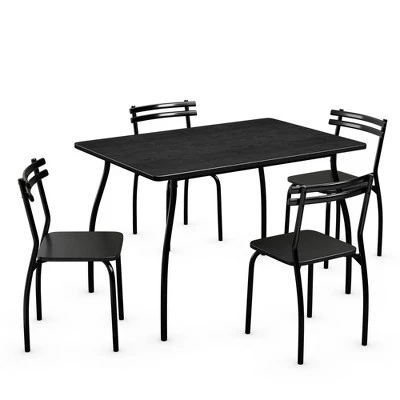 This is our elegant 5-piece wooden dining set, which is perfect to Complete your dining room or kitchen. This set includes one table and four chairs. Made of engineering MDF and powder-coated steel, it will provide you years of durable and reliable use. Four armless chairs feature ergonomic back, offering unparalleled comforts for you and your families. With the simple design and modern element, this furniture set is not only a function dining set, but also a decoration to your home. Buy yours today!