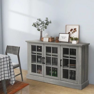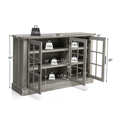 Looking for a simple cabinet? Don’t miss our farmhouse sideboard. The sideboard with farmhouse flair adds a touch of modern charm to your living room, kitchen, dining room, etc. It can serve as a sideboard, a buffet cabinet, a storage cabinet or a cupboard. With spacious countertop and 2 enclosed cabinets, it offers enough storage space for your spice jars, tablewares, kitchenwares, wine bottles, keepsakes and collectibles. Besides, 4 adjustable shelves make it be suitable for items of different heights, bringing you much convenience. Solid frame, stable base and anti-toppling system keep it durable and sturdy. In addition, it’s equipped with 3 tempered glass doors with anti-rust handles to avoid dust and protect inside items.