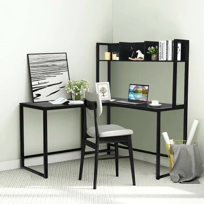 The L-shaped desk with hutch can be the highlight in your living room, study room or office. Features wide desktop to accommodate various daily essentials and open storage hutch to classify some necessities, the writing desk can satisfy your desire in different occasions. Besides, with appropriate height, the open storage hutch makes anything you place on it accessible within arm’s reach. Crafted from premium iron material, the corner desk with sturdy construction ensures reliable support and maintains ex cellent stability. Furthermore, L-shaped design helps you solve the problem of multitasking or 2-person working simultaneously. Bring the corner computer desk to home office and max imize your workspace perfectly.
