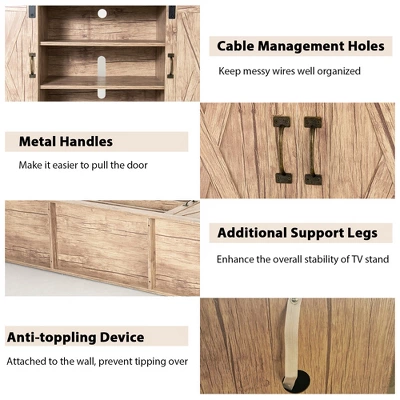 Our TV stand is a charming complement to your home that combines practicality and beauty! Featuring a wide tabletop, this TV stand can hold up to 65” of TV. The sliding barn doors and 3-tier open shelf provide you with multiple storage options for assorting wide arrange of media items. Reasonable space arrangement creates a clean and tidy impression for your home. You can also use it as a console table to facilitate storage. Moreover, the pre-drilled cable management holes are designed to keep wires organized. Equipped with the anti-tipping device, the media console table can be attached to the wall to avoid wobbling. With chic appearance and modern design, the TV cabinet matches seamlessly with any interior decoration and also adds a touch of elegant charm to your home.
