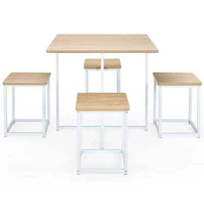 This dining table set includes a table and 4 stools, which can accommodate 4 people so that it creates a place for eating a meal or having a talk. After finishing a meal, you can move 4 stools under the table to save space. Besides, the dining table set is made of anti-rust steel frame and MDF which is durable and stable. Additionally, the elegant appearance can match various furniture styles, not only in your home, but also in the restaurant and coffee shop.