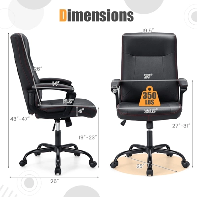 Our ergonomic desk chair features backrest and padded armrests to provide ultimate comfort and support, no matter how long your workday is. The premium leathaire cover with tightly-stitched seam gives it a modern touch while the high-density sponge ensures long-lasting comfort. Besides, the seat can be adjusted to fit your height, and the back can rock after you loose the tension control. Supported by a high-quality pneumatic cylinder and a robust metal base, the swivel task chair has a sturdy construction that holds up to 350 pounds – perfect for anyone who needs a reliable chair. With superior quality and high-end look, the upholstered office chair has various applicable scenarios, including home, office and conference room.
