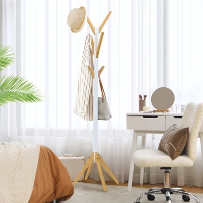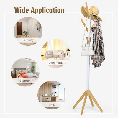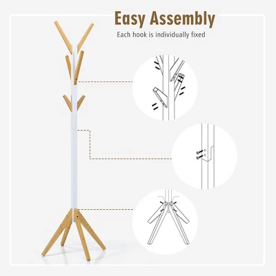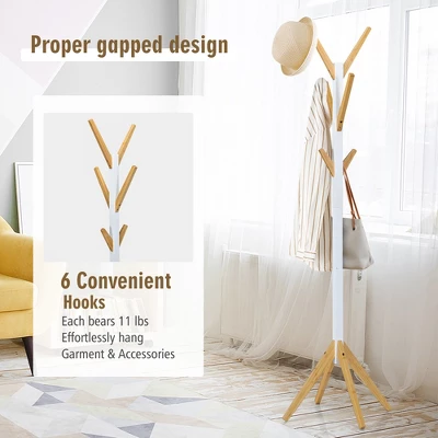 It is designed with a narrow and long shape that requires little room for standing. Yet 6 hooks with reasonable gaps and length add ample hanging capacity for clothing and accessories without any wobbling. Painted with white and natural finishing, this freestanding coat hanger is elegant and suitable for many rooms, such as foyers, living rooms, office workspace, and more. The pure bamboo structure has 4-claw legs for optimized stability and durability. It is easy to assemble with illustrated manual with each hook fix ed individually.