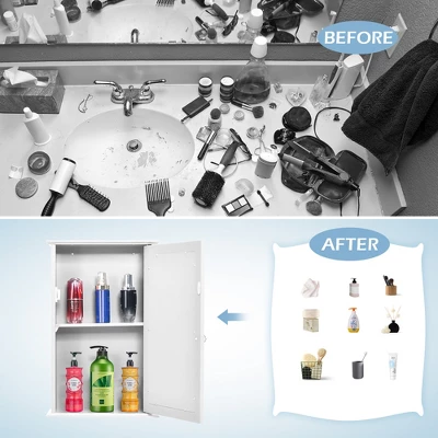 Are you looking for a storage organizer that can help you get rid of bathroom clutter? Then our mirrored wall cabinet may be a good solution. 2-tier design is convenient for storage and organize. And there is an adjustable shelf so that you can rearrange the space by adjusting the shelf. Close the door and hide the messy pieces from your sight, then you can enjoy the reflect in the clear mirror and do your morning routines. Besides, the cabinet is constructed of painted MDF material and durable metal accessories, and is securely mounted on the wall by reliable expansion screws. In addition to bathroom, you can also install it in your living room, laundry room, entryway, etc.