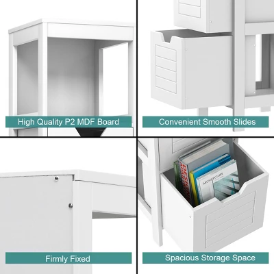 The simple and modern style of our floor cabinet, can show your elegant temperament and enhance your quality of life. You can put it in the bathroom, living room, bedroom, office and lounge. It has a total of three floors, and you can hide privacy items in two drawers. Drawer handles are hollowed out, which can ensure the safety of your kids. It is made of MDF P2 board, which is wear-resistant, strong in load-bearing capacity and durable. The stable support legs design makes the structure stronger. The smooth surface is easy to clean and maintain. And you can assemble it in a short time.