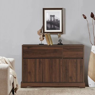 Do you need a buffet sideboard or a console table? Owning this storage cabinet, you will have all. Equipped with 2 drawers and 2 cabinets, the console table can effectively keep your household items in good order. Besides, sturdy and stable structure ensures that it can hold them safely. The pads at the bottom not only provide stability, but also prevent floor scratching. The notched handle design help you open drawers and cabinets easily. Made of P2 standard MDF Board and particle board, it is both environmental friendly and durable. Featuring beautiful wood grain and mid-century style, this buffet sideboard can perfectly fit your rooms’ style and furniture.