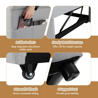 It’s a cozy sofa or lounger by day, but quickly becomes your friend’s sleeper bed at night, easily transforming your living room into a guest’s bedroom. 6-level adjustable backrest meets your different needs, like watching TV, reading books, sleeping and more. Padded with high-density sponge and covered with breathable linen-like fabric, the pull-out sleeper chair gives you comfortable sitting experience. The soft pillow provides you with adequate lumbar and neck support. Considering your convenience, this sofa bed is designed with 6 side pockets to store books, remote controls and other items. Furthermore, sturdy metal frame ensures longer reliable usage and 330 lbs weight capacity.