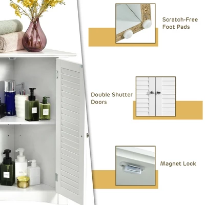 Wonder what the corner in your home can do? Come on and check this cabinet out!This corner storage cabinet can maximize the utilization in any corner space of your home. Featuring the traditional shutter doors, the storage cabinet not only guarantees good ventilation but effectively stores and classifies your toiletries and towels in order. Made of P2 standard MDF, each shelf of the classic floor cabinet can hold up to 22 lbs, bringing endless charm to your interior space. The adjustable shelf is designed for 5 flexible storage options, perfect to fit the corners and nooks in your home for higher space efficiency. It is easy to assemble and maintain.