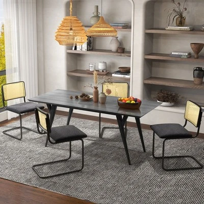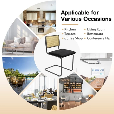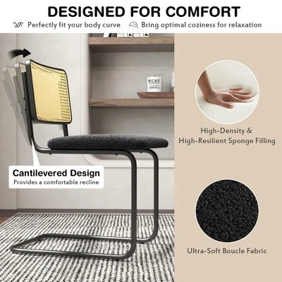 The mid-century modern dining chairs set of 2 adopts unique cantilever design and features geometric aesthetic, making it an eye-catching presence in your living room, dining room, kitchen, etc. Besides, the 2 set side chairs comes with a rattan backrest, which is breathable to dissipate heat. Moreover, the slighted slanted ergonomic backrest sways slightly when someone sits in it to provide optimal recline. And the seat of the chair is filled with soft sponge, allowing you relax with comfy design. Additionally, the solid wood seating board is sturdy and crack-resistant. Meanwhile, the metal curved legs make it stable and sturdy to bear 330 lbs. Equipped with non-slip protectors, the side chairs with cane back is not easy to wobble and scratch your floor. And it is easy to assemble.