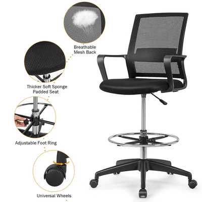 Sitting comfortable at your office or home with our mid-back black mesh drafting chair! The ergonomic back design fits your body perfectly and the massage lumbar support will relieve your backache effectively. The adjustable seat height and footrest will match up various heights of tables for your convenient use. The swivel seat is padded with 2” thick high-density sponge and covered with black mesh upholstery. Five wheels on the base offer easy and smooth motion on the floor. With its sophisticated appearance, this modern drafting chair is suitable for both home and office. Complete all your tasks on this stylish chair that will keep you comfortable throughout the day! Do not hesitate to add it to your cart!