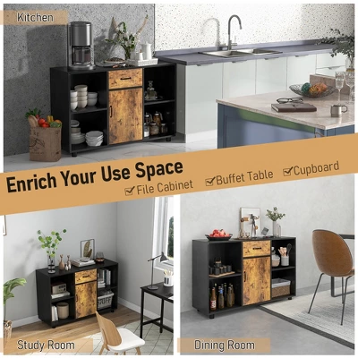 - Diversified Storage Space: The buffet sideboard features a wide cabinet top to hold household appliances. In addition, attached with 4 open cubbies, 1 slide-out drawer and single door cabinet, the buffet table is a perfect solution that enlarges storage capacity and display space for kitchen supplies.