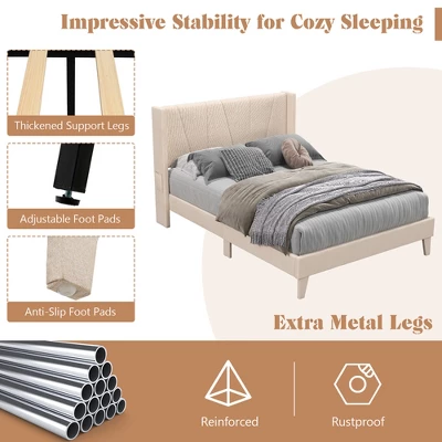 Superior comfort is ensured by soft sponge & breathable linen fabric. More, the bed frame features a 42” high wingback, allowing you to lean comfortably. Thanks to 2 side pockets & 6.5” high under-bed space, you can neatly organize your sundries. Also, the bed frame is very strong to support 660 lbs weight. Thickened support legs& extra metal legs ensure perfect stability together, while anti-slip foot pads & adjustable foot pads further improve overall balance. EVA mute bars are also useful to avoid squeaks. Finally, slats come with hook & loop fasteners that are very easy to install, while you can further fix them with included screws. The platform bed needs no box spring, the suitable thickness of mattress is 8”-12”.
