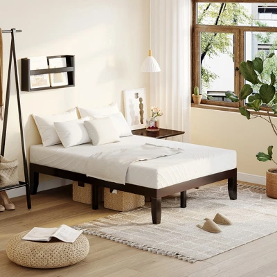 - User-Friendly Details: With 14” raised height, the bed frame has roomy space underneath. Therefore, you can store multiple items under the bed, such as luggage, suitcases, outdated items and so on. The spacious underbed space also allows a robot cleaner to pass through for simple maintenance. Additionally, you can directly put the mattress included on the frame without box spring.