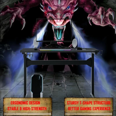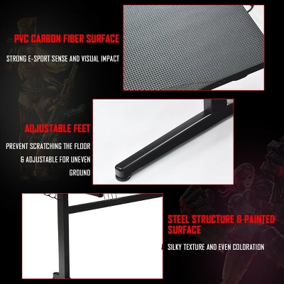 It features large gaming desktop that can withstand 220 lbs of weight, providing ample room for your monitor, PC, laptop, speakers and more.PVC carbon fiber surface is scratch-resistant and easy to clean, reveals excellent performance to allow you to enjoy gaming in enough space. Equipped with a cup holder, a headphone hook and two controller stands, the E-sports table will keep all of your gaming gears organized and be convenient for your daily needs. T-shape frame constructed with steel pipes ensure the stability and durability of the table, accompanying you to enjoy your time in playing games.