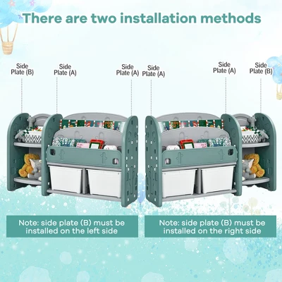 Developing good habits of organizing and reading with our toy storage organizer! It comes with 2-tier extra-large storage shelves, 2-tier wide bookshelves and 2 detachable storage bins which provides sufficient places for your little ones to put toys and books. Crafted with safe and environmental-friendly HDPE material and thickened shelves, the toy organizer can stay stable, durable and impact-resistant. The opening storage design not only makes it easy for kids to find and grab toys and books but also helps them develop habits of reading and organizing. Ideal as toddler’s cabinet in the nursery, playroom, kindergarten; perfect as kid’s bookcase in study, school, even works great as a storage cabinet in entry and living room.
