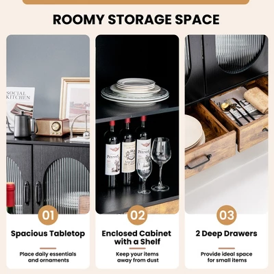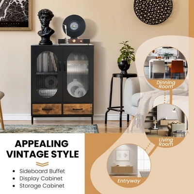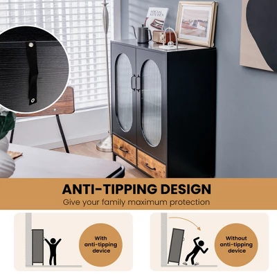 It has a 2-tier storage cabinet and 2 deep drawers that can sort and hide a variety of sundries. Besides, the spacious countertop is ideal for displaying your favorite ornaments, photo frames and vases. Thus, the cabinet can be used as a buffet sideboard, display cabinet, storage cabinet according to your different needs. The industrial appearance and corrugated tempered glass doors make it stylish and eye-catching. Besides, durable and rustproof steel frame ensures long-lasting service life. The strong load capacity and anti-topping device allow you to store items with confidence. Furthermore, waterproof surface and 4” ground clearance make cleaning a breeze for you.