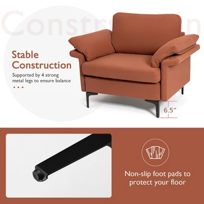 - Modern Fabric Accent Chair: This accent chair is carpeted with skin-friendly lint fabric with soft touch and gloss. This kind of fabric is not easy to deform, fade or wrinkle. It also gives the accent chair a dignified outlook to match with modern or mid-century styled homes and offices.