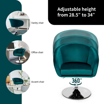 Our swivel velvet chair can not only be a good decoration to your house but also a practical chair. It can be your vanity chair, bar chair, office chair and accent chair. The whole makeup chair is designed with round back, which will better fit your body and offer you more support. Outside, the makeup chair is covered with premium velvet with great durability and breathability. Inside, the vanity chair is filled with high-density sponge which is not easy to deform and further improves sitting comfort. Besides, there is a height-adjustable lever with which you can easily choose preferred height. And coming with a heavy-duty metal base with non-slip rubber ring, the makeup chair can maintain great stability when you are rotating. Now do not hesitate to order it!