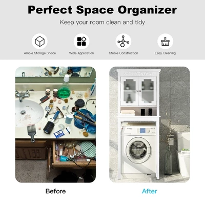 Come and enjoy simple and convenient lifestyle from now on with our over-the-toilet storage cabinet!This toilet shelf rack features a 3-tier shelf with large space which allows you to store multiple toiletries. You can put your personal items in the shelves with doors which have frosted glass to better protect your privacy and also add a sense of elegance to your room. As is made of premium MDF and pine wood, this bathroom storage rack is solid and durable and the surface is smooth and easy to clean. It suits most standard toilets and will certainly be a great addition to any room. If you want to lead a clean and tidy lifestyle, you will be satisfied with it.