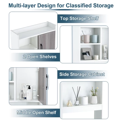 - Multi-layer Design & Classified Storage: This 4-tier over-the toilet bathroom storage cabinet can effectively avoid clutter and make your bathroom well organized. The top storage shelf, 2 side open shelves, enclosed cabinet with door and middle open shelf provide large space to place toiletries, towels, tissue, aromatherapy, shampoos, decorations, etc.