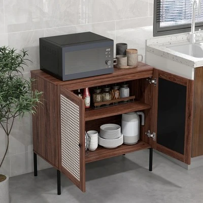 Have you found a favored kitchen storage cabinet? This buffet sideboard would be one of the appropriate choice for you. The combination of spacious cabinet top and concealed cabinet provides ample storage space for various kinds of kitchen supplies. The inner shelf can be adjusted in 3 positions to fulfill different storage needs. Moreover, considering higher security, the kitchen sideboard can be firmly fixed to the wall with anti-toppling device to avoid wobbling. Sturdy metal legs also provide reliable support for buffet server cabinet. All in all, this wooden cupboard with exquisite rattan decorated doors matches well with other furniture and adds aesthetic beauty to your living surroundings, whether in kitchen, or dining room.