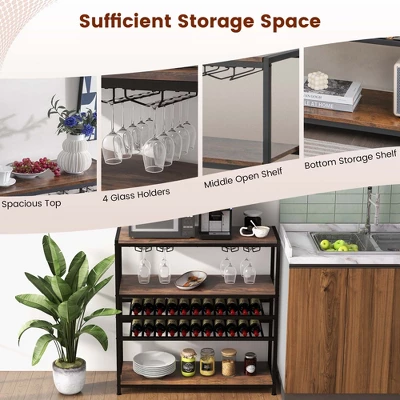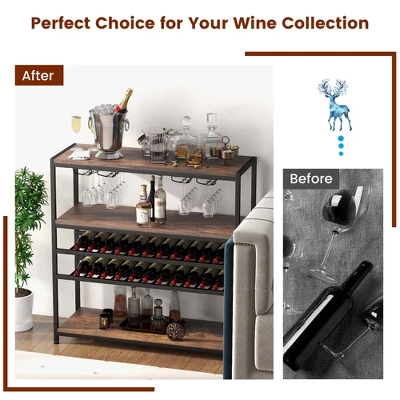 - Large Wine Rack Table: This wine rack table is the perfect choice for your wine collection. It has 2-tier wine rack with 22-bottle capacity and 4 rows of glass holders for 20 glasses. Besides, 1 spacious top, 1 middle open shelf and 1 bottom storage shelf are also great for placing your cups, toasters, microwave ovens or ornaments.