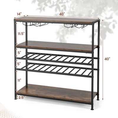 Do you want to own a mini home bar? Our industrial wine bar table is a nice option for wine lovers. It has 2-tier wine rack and 4 rows of glass holders f or you to collect 20 glasses and 22 wine bottles. Plus, 1 wide top, 1 middle shelf and 1 bottom shelf provide additional storage space for fruit plates, dishes and small kitchen appliances. You can use it as a bar cabinet, wine rack table, display rack or buffet table in different places. Additionally, with solid metal frame and adjustable feet, our wine bar cabinet allows for excellent durability and stability. Meanwhile, it is also equipped with anti-toppling devices for extra sturdiness.