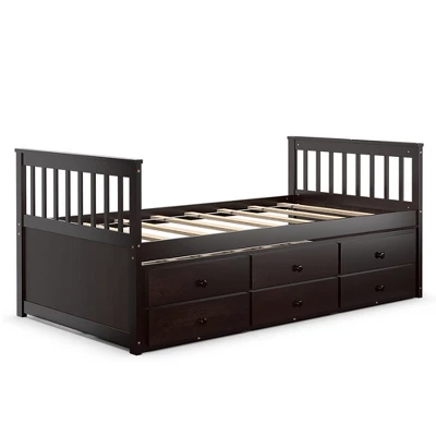 Our twin captain’s bed made of high-standard solid wood, this captain’s bed with trundle bed and 3 drawers is sturdy and stable enough for years of use and enjoyment. Stable bed slats and headboard provide safety for you when you sleep. Equipped with 3 built-in drawers, this twin size bed is perfect for adding storage space in your house. And the pull-out twin trundle bed makes it easy to create the extra sleep space when needed while saving a lot of space. It is ideal for accommodating guests, sleepovers or for family with 2 kids. And the classic design can blend in with any color scheme and existing furniture of your house. Enjoy a wonderful doze of cozy and comfort with this elegant and well-crafted bed!