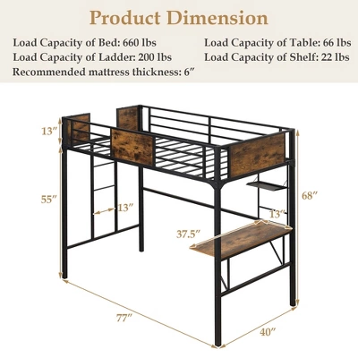 Having trouble deciding which bed to choose for your bed room? Then our industrial metal loft bed with working desk is worth having ! With the combination of the study bed, storage tray and twin bed, this multifunctional bed frame offers a practical and space-saving solution for your bedroom. Additionally, crafted from durable metal and MDF materials, the bed frame can hold up to 660 lbs. What’s more, the built-in working desk, creates an effective workspace for studying or working. Besides, the bed frame also has sturdy bed frame details such as anti-tipping device and safety guardrails for enhanced safety. Upgrade your bedroom with this versatile and functional bed frame today.