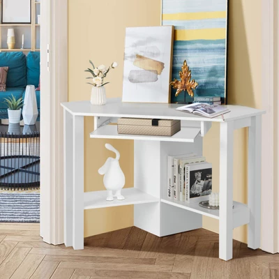 This is our new corner computer desk which is a compact and functional item. Be made of wood ,it is sturdy and durable . Corner design help you maximize your limited floor area. It has a large opening drawer to store your keyboard, And two opening storage space underneath for host computer , miniprinter, books ,CDs and so on. Can be used as study desk, office desk, home office desk workstation and computer desk. This desk compliments any room and is a great addition to any home office