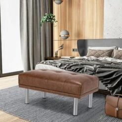 Costway Ottoman Footrest Stool PU Leather Rectangular Seat W/Metal Legs Brown/Black